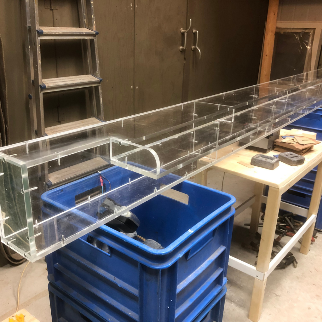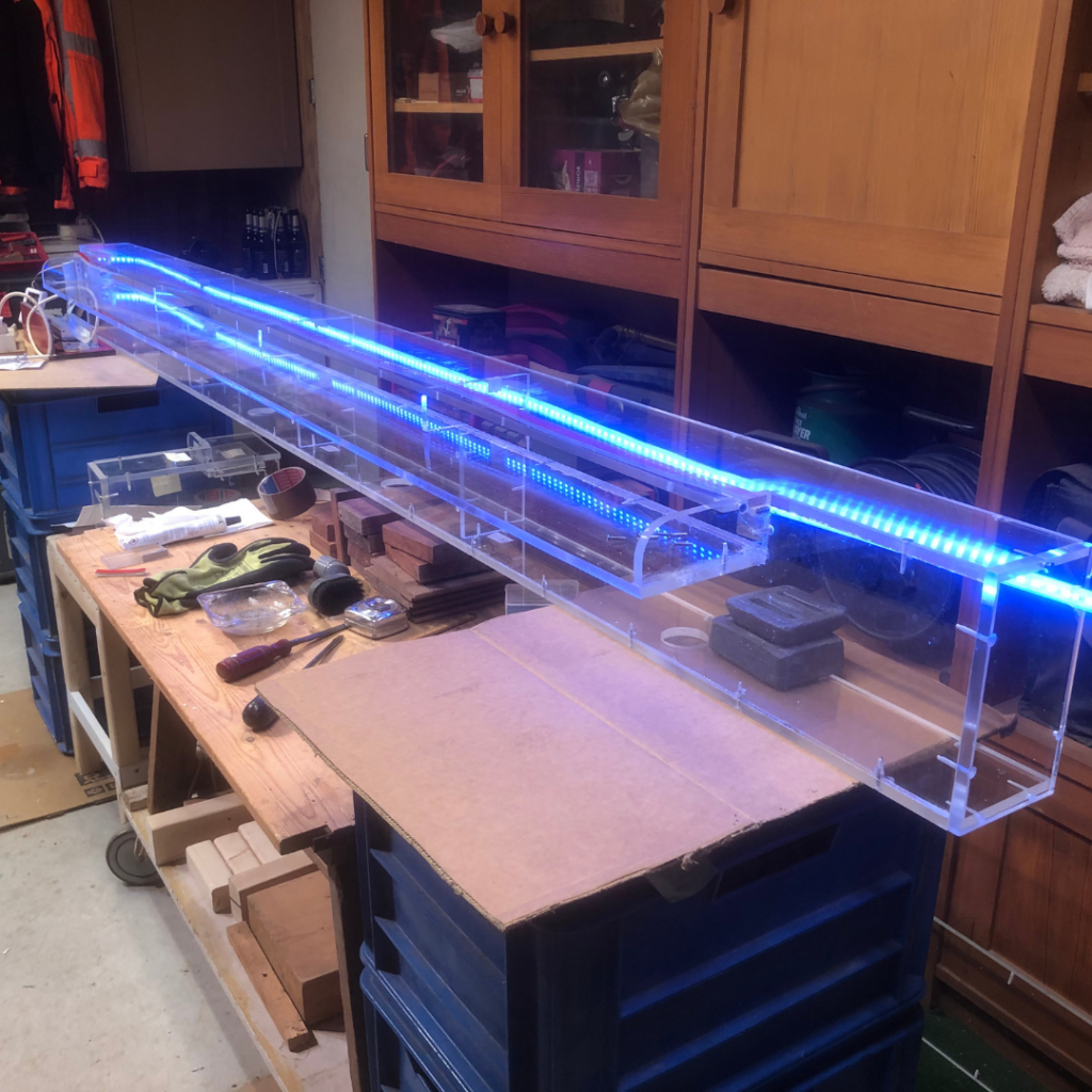 Ruud ha realizzato una cascata lunga 2,5 metri con un flusso d’acqua di 2 metri. La struttura è interamente in plexiglass e dotata di illuminazione LED nella vasca di raccolta, che crea un sorprendente gioco di luci grazie ai bordi lucidati della lastra. I componenti sono stati avvitati e incollati utilizzando colla per metacrilato. Lavorando con materiali plastici, Ruud sottolinea l’importanza della precisione: “È necessario preforare e filettare 3 o 4 volte, e raffreddare sempre bene!” La piastra superiore è fissata solo con viti, per consentire un facile accesso all’interno in caso di manutenzione o rimozione di alghe.
