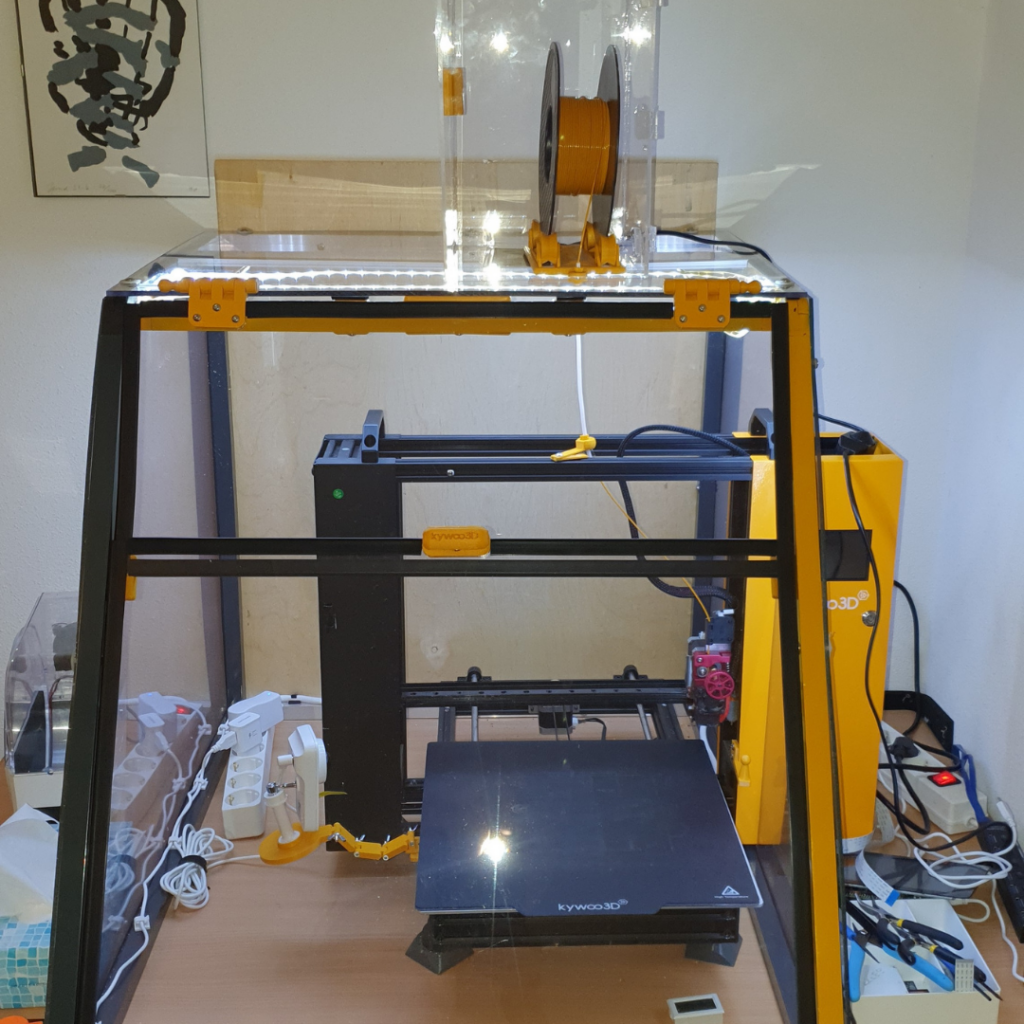 Per creare condizioni ideali attorno alla stampante 3D, Jan ha costruito una struttura con tubi di alluminio quadrati e pannelli in plexiglass. Il risultato è un design ordinato e moderno che consente di monitorare facilmente il processo di stampa, mantenendo al contempo una temperatura stabile. Jan racconta: “Volevo realizzare un rivestimento esteticamente piacevole per la mia stampante 3D, che mantenesse la temperatura ottimale per ottenere il miglior risultato possibile.”