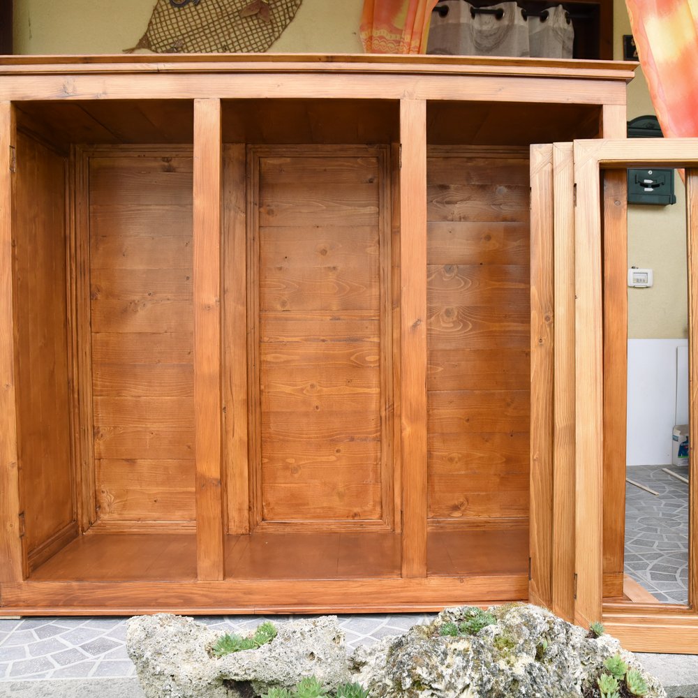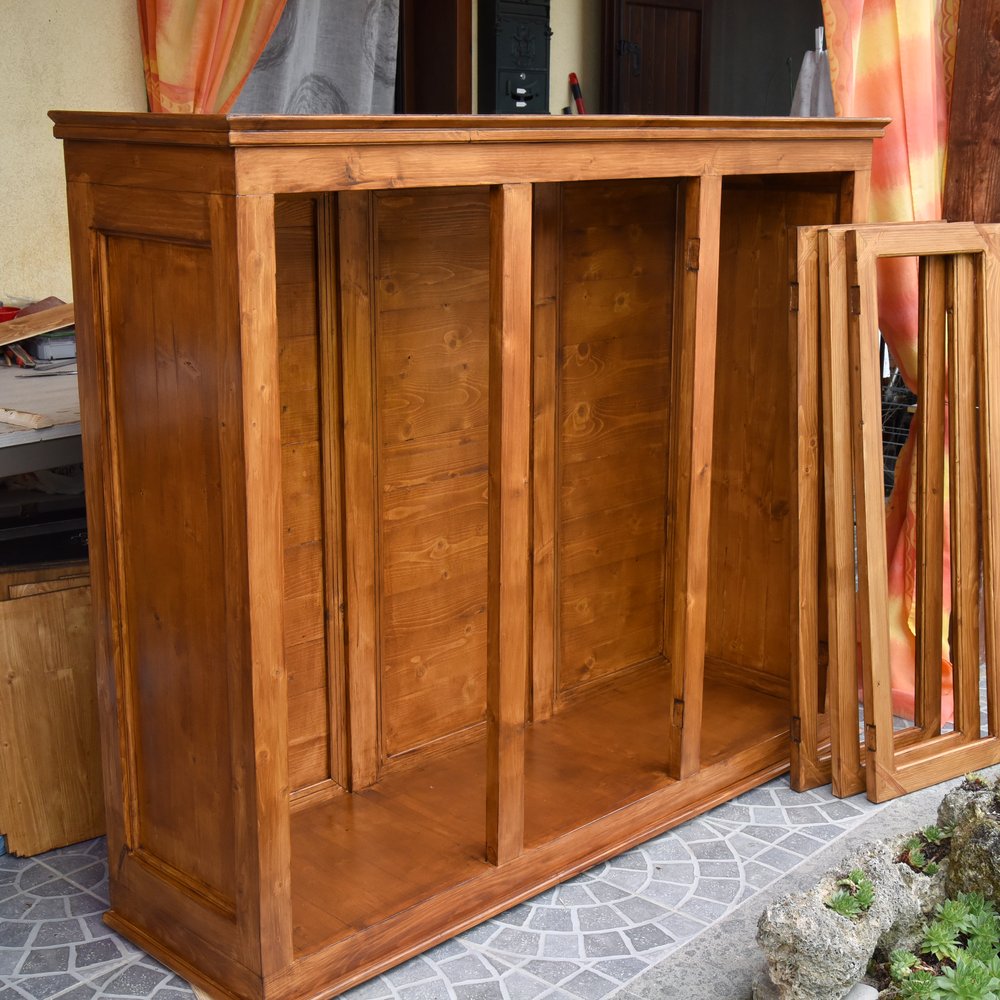 Gianni ha costruito una credenza completa, composta da una parte inferiore e una superiore. La sezione inferiore comprende due cassetti con guide in legno e due ante, mentre la parte superiore è dotata di tre ante con plexiglass trasparente da 3 mm. L’intero mobile è stato realizzato utilizzando legno di pino recuperato, che altrimenti sarebbe stato destinato allo scarto.