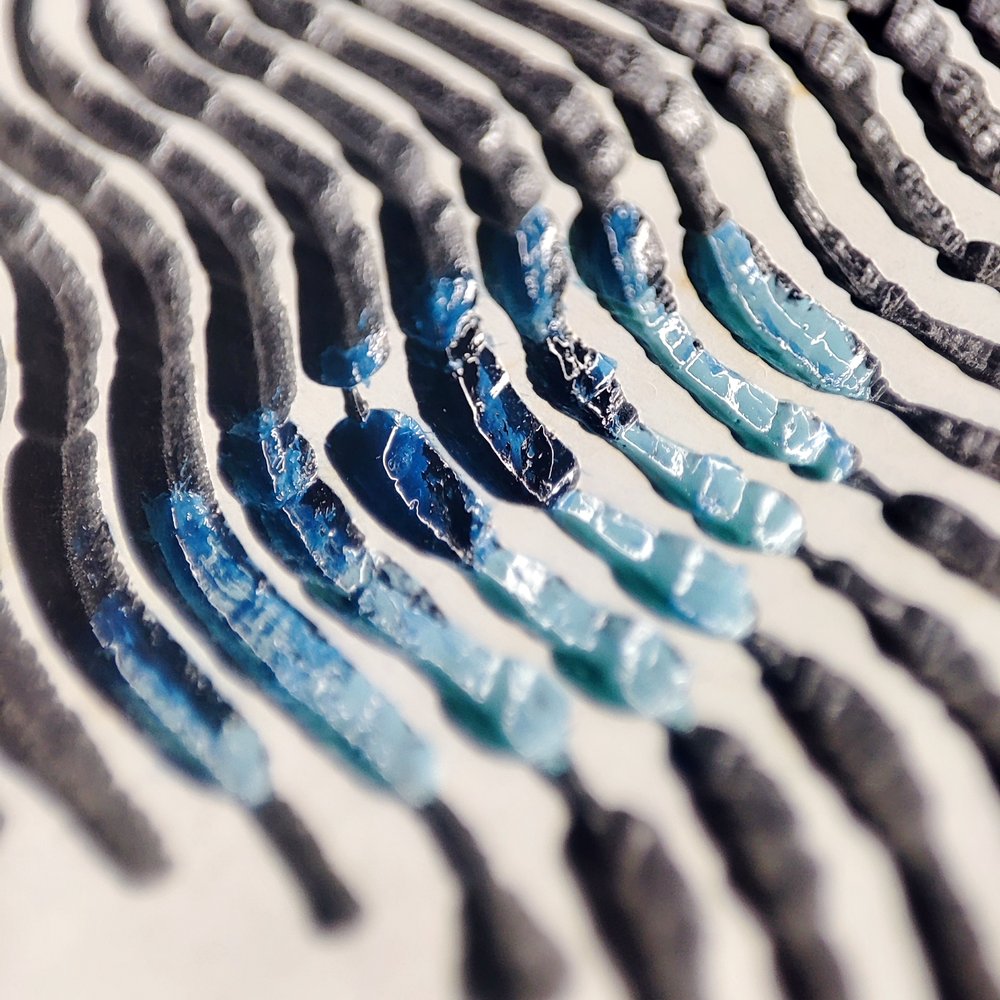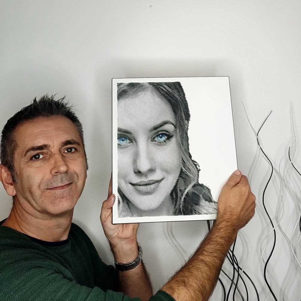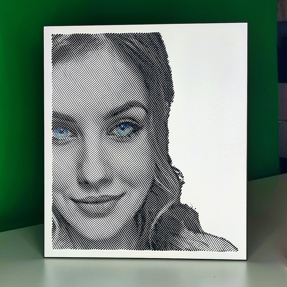 Andrea ha iniziato con una fotografia, che ha modificato digitalmente per mettere in risalto ogni dettaglio. Successivamente, ha convertito l’immagine in un file compatibile con la sua macchina CNC. Con una fresa a 90 gradi ha inciso il disegno su una lastra di HPL, poi ha dipinto a mano libera alcune parti per aggiungere profondità e colore. Infine, ha applicato un supporto per poter appendere facilmente l’opera al muro.