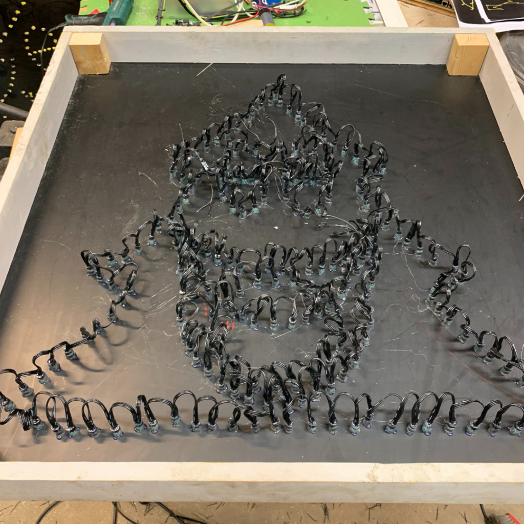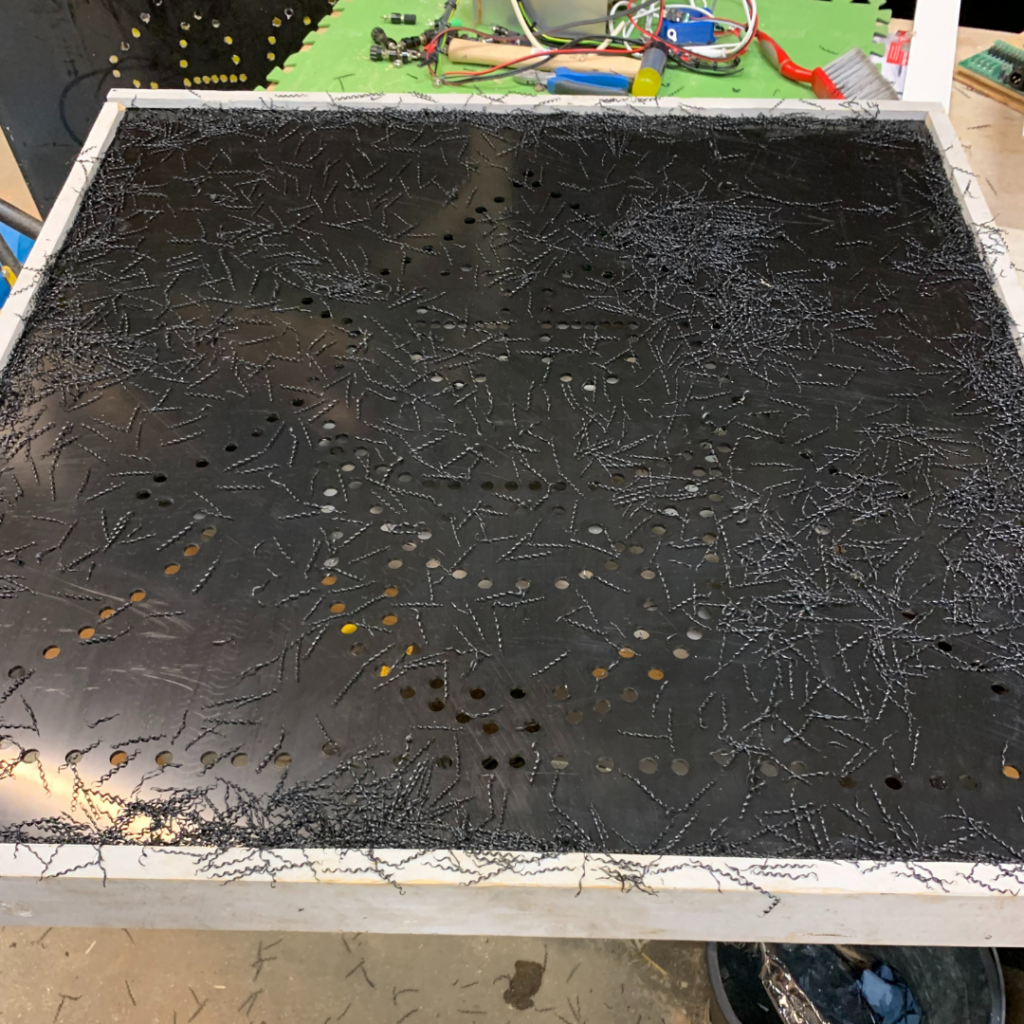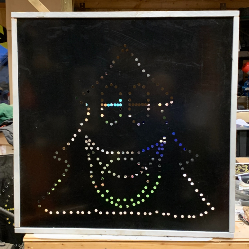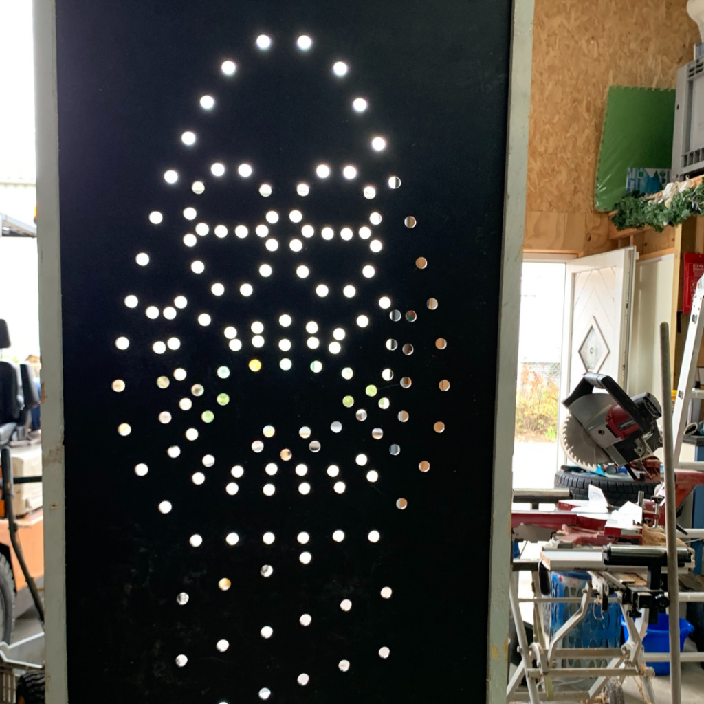 Mark ha realizzato diversi pannelli luminosi a tema natalizio, utilizzando HDPE nero come base e fili di luci LED. “Ho praticato dei fori nei pannelli per inserire le lampadine LED in modo saldo e ho realizzato cornici in legno per rifinire i bordi con ordine,” racconta. Ha anche creato un pannello con un Babbo Natale che canta!