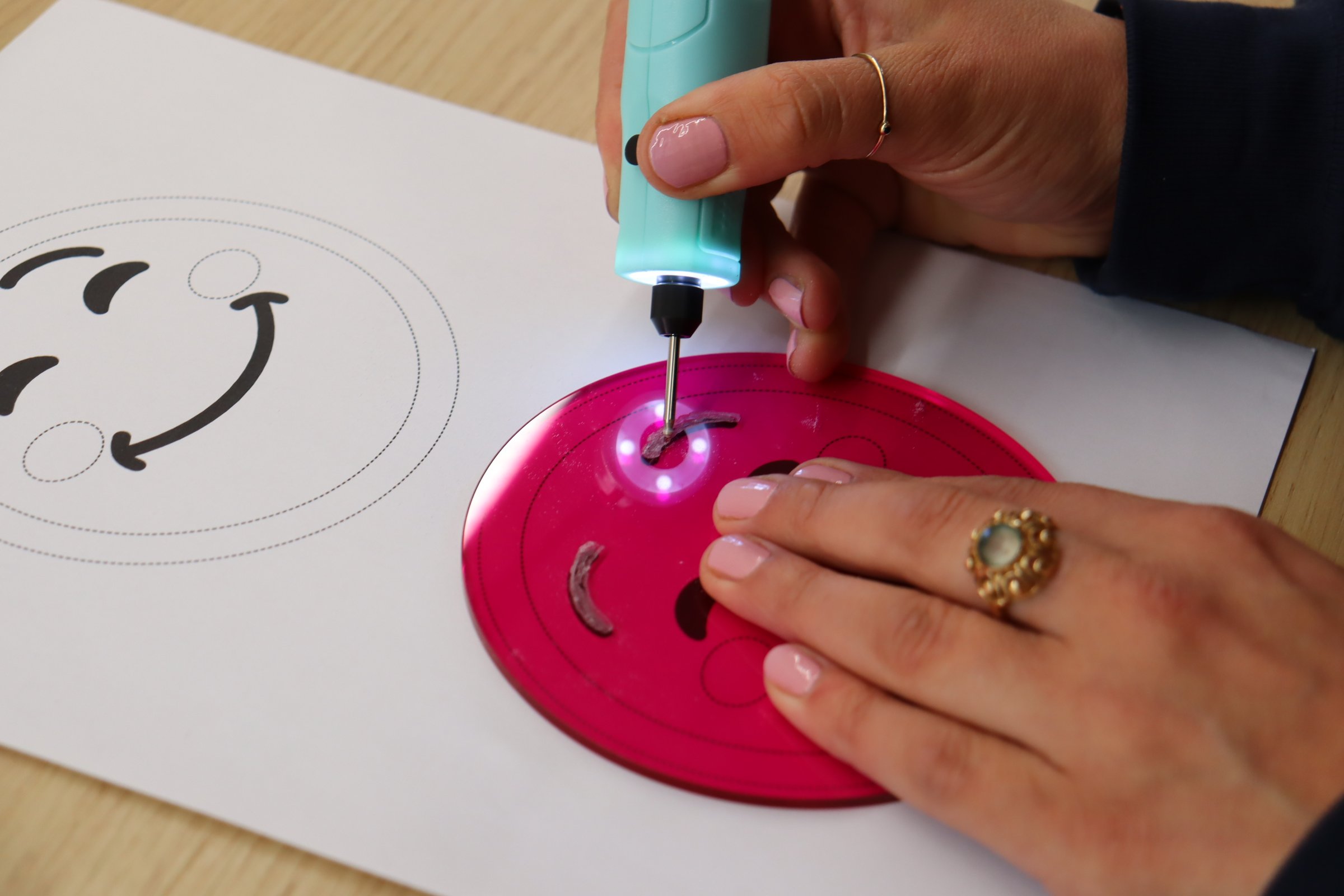 Prima di iniziare, rimuovete delicatamente il film protettivo dalla parte superiore della lastra di plexiglass. Lasciate intatto quello sul lato inferiore per proteggerlo da graffi durante il lavoro. Prendete la penna per incisione e seguite lentamente e con precisione le linee dello stencil. Applicate una pressione uniforme per ottenere un’incisione chiara e omogenea.