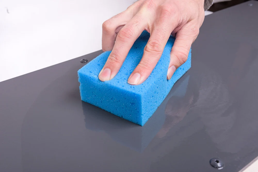 Utilizzate una spugna o un panno morbido per applicare la soluzione detergente sulla superficie del Trespa. Strofinate l’intera superficie senza esercitare troppa pressione, in modo da rimuovere sporco e polvere senza graffiare.
